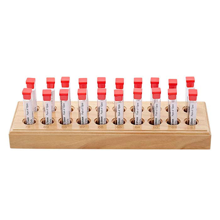 O tamanho do eixo corresponde ao tamanho da broca. Este conjunto de 200 inclui 10 de cada dos tamanhos #61–80. Os tamanhos incluem:
