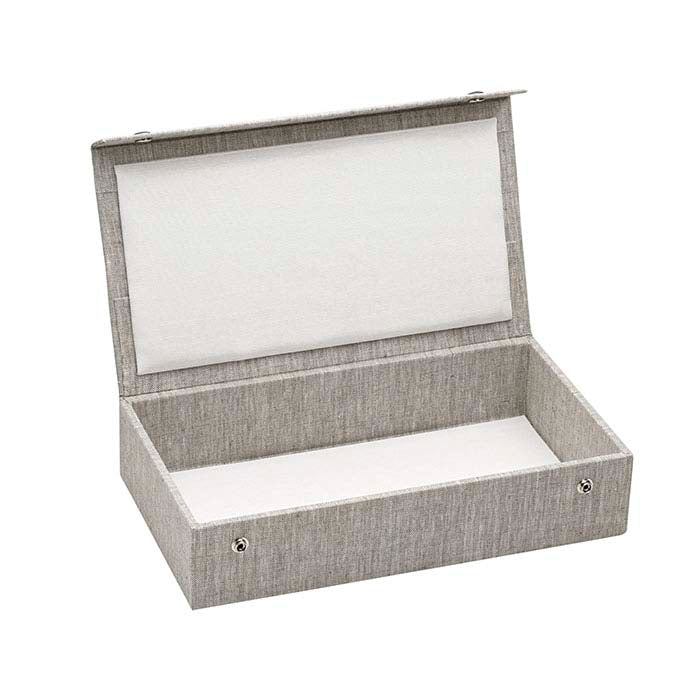 Esta bandeja de tamanho completo oferece uma opção atraente e económica em espaço para armazenar ou transportar as suas joias; uma tampa com fecho de pressão garante que as joias permanecem seguras. O linho oferece uma superfície naturalmente texturada que realça todos os tipos de metal. Escolha uma altura de bandeja que permita que as peças fiquem completamente dentro da bandeja para que várias bandejas possam ser armazenadas ou embaladas em caixas de viagem sem danificar as joias. Utilize inserções ou almofadas para bandejas de tamanho completo conforme necessário para suportar as suas joias (disponíveis separadamente). O linho natural cobre esta bandeja de madeira e cartão resistente; o cetim creme forra a tampa; os fechos de pressão resistentes são de latão.
