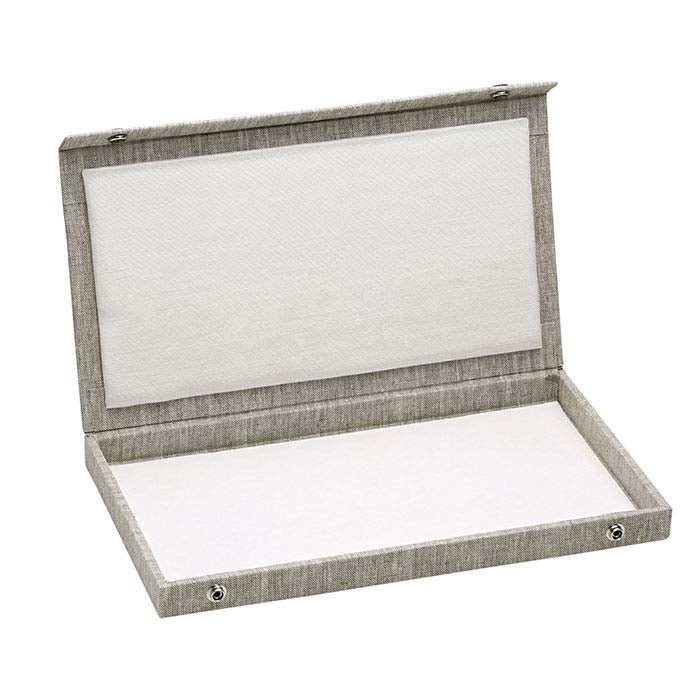 Esta bandeja de tamanho completo oferece uma opção atraente e económica em espaço para armazenar ou transportar as suas joias; uma tampa com fecho de pressão garante que as joias permanecem seguras. O linho oferece uma superfície naturalmente texturada que realça todos os tipos de metal. Escolha uma altura de bandeja que permita que as peças fiquem completamente dentro da bandeja para que múltiplas bandejas possam ser armazenadas ou embaladas em caixas de viagem sem danificar as joias. Utilize inserções ou almofadas para bandejas de tamanho completo conforme necessário para suportar as suas joias (disponíveis separadamente). O linho natural cobre esta bandeja de madeira e cartão resistente; o interior da tampa é forrado com cetim creme; os fechos de pressão resistentes são em latão.