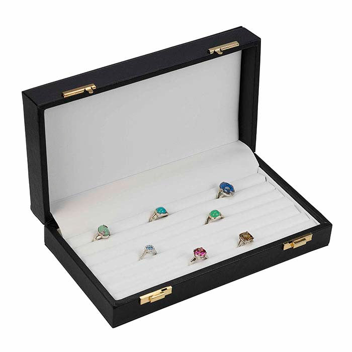 Этот футляр для колец на петле обеспечивает достаточное пространство для демонстрации и хранения во время путешествий и торговых выставок. Он оснащён непрерывными слотами, в которых можно разместить до 36 колец. Мягкая итальянская искусственная кожа чёрного цвета покрывает коробку; белая искусственная кожа покрывает петлю и выстилает внутреннюю часть. Металлические петля и защёлки выполнены из латуни.