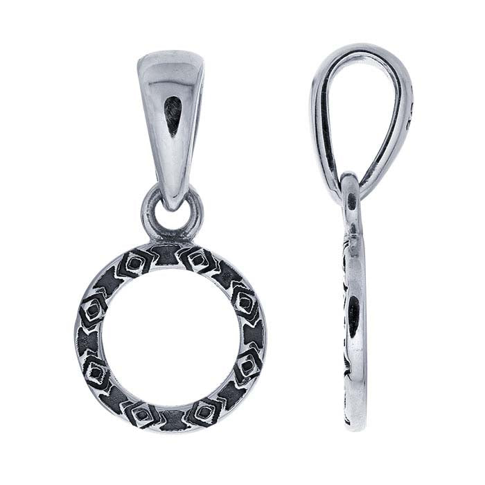This sterling silver charm offers a 9mm circle with a stamped design and is oxidized to highlight the details. Use it as-is or combine it with other pendants and charms in more complex designs. This charm includes a tapered bail.