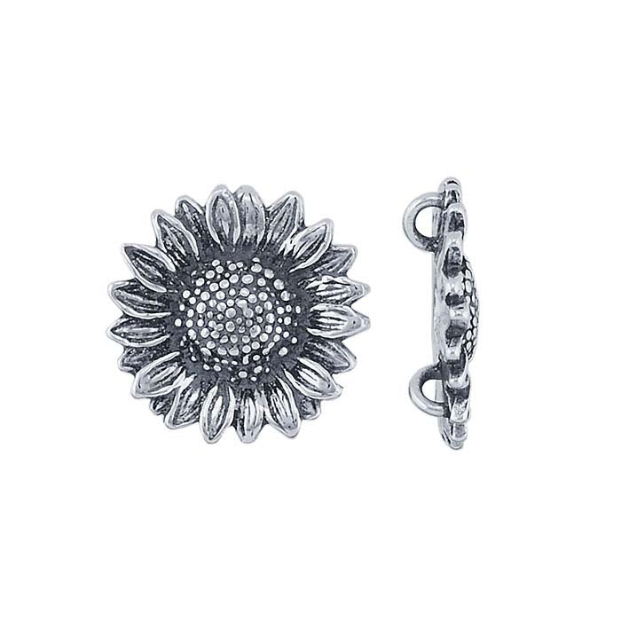 This sterling silver festoon pendant features a sunflower design with intricate and life-like detailing. The dimensional styling gives the appearance of layered petals and the spiraling center draws the eye. Use it as the centerpiece of a delicate chain necklace or combine it with drops and dangles for a more complex look. Two offset hidden bails—designed to remain out of sight in order to highlight the pendant—make this pendant easy to complete as a necklace; the festoon design ensures the pendant remains centered on a necklace. The pendant is oxidized to highlight the details.