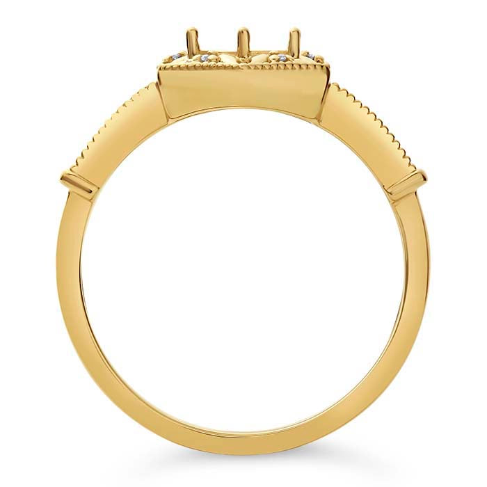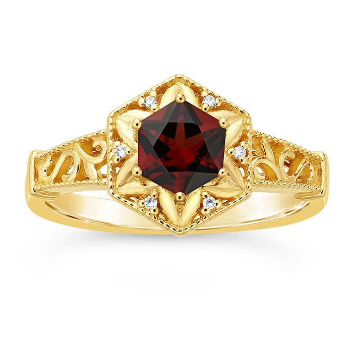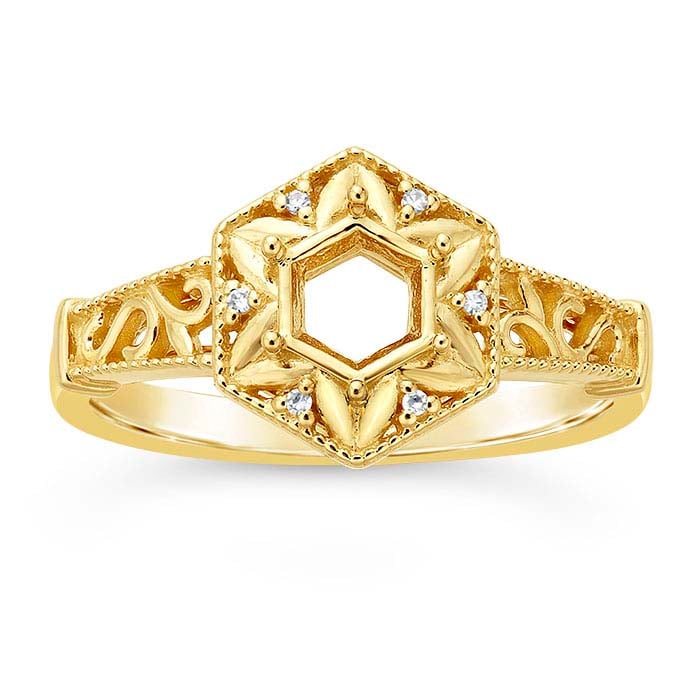 Denna 14-karats guldring har en 6-klor, förskuren hexagonfattning med sex 0,08 mm runda diamanter—en på varje sida—för extra visuell effekt. Fattningen håller en 5 mm hexagonfasetterad ädelsten och har fin milgrain-detaljering, medan den övre delen av ringens skaft pryds av delikat scrollarbete för en elegant look. Hela ringen har en ljus, iögonfallande finish.