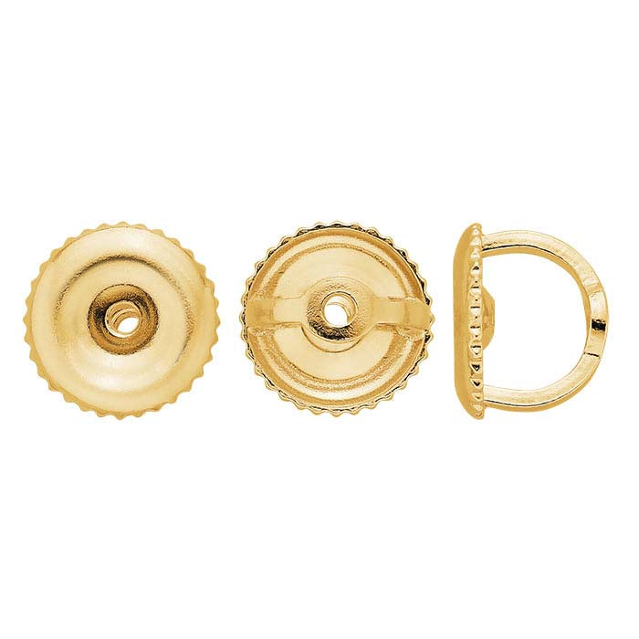Denna 14-karats guldsnurrade öronmutter har en slät yta och är utformad för användning med en gängad stift (ingår ej) och ger en extra säkerhet vid användning.