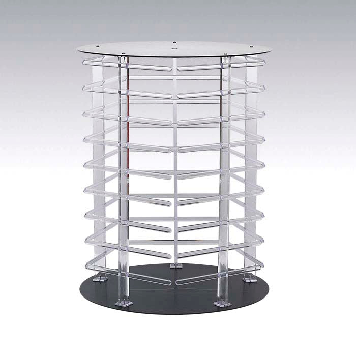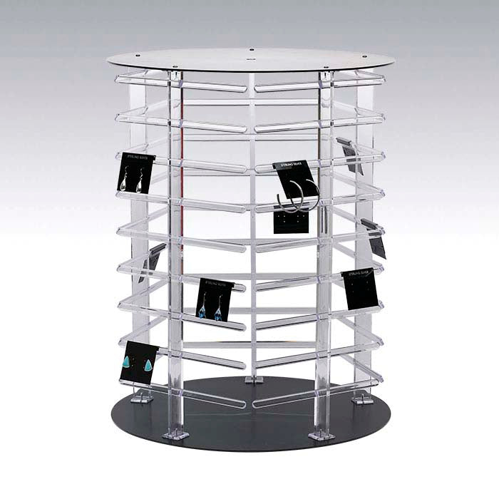 Denna klara akryl femsidiga roterande display ger utrymme för att visa ett brett urval av smycken; dess roterande bas snurrar smidigt för att låta kunder enkelt bläddra i ditt sortiment. Displayen har nio klara akrylstänger på varje sida som är 2" isär; hela displayen rymmer upp till 180 kort på 2". Stängerna är tåliga och flexibla, vilket minskar risken för brott, och den transparenta akrylen håller kundernas fokus direkt på de hängande korten. Tillverkad av klar akryl; topp och bas är svart akryl.