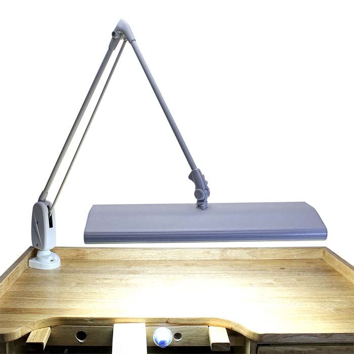 Denna metallampa av premiumkvalitet har en fullt justerbar 43" flytande arm för bekväm och exakt positionering. Lampans utsida är pulverlackerad för hållbarhet och lång livslängd. Den universella klämfoten har en öppning på 2" och kan fästas på alla vertikala, horisontella eller lutande ytor; den kan även monteras på vilken horisontell yta som helst. Lampan levereras med tre standard lysrörslampor i kallvitt (6500K), 15 watt, 18" långa, samt en 7 fot lång sladd med trefas jordad kontakt. UL-godkänd. Lampan inkluderar tillverkarens tvååriga elektriska garanti och fem års mekanisk garanti.