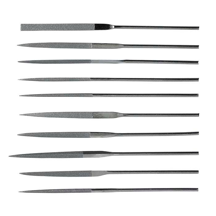 Detta ekonomiska set med diamantnålfilar innehåller 10 vanligt förekommande filformer för att säkerställa att du enkelt kan få tillgång till den stil du behöver när du behöver den. Setet inkluderar en 120/140-maskfil av varje form: flat, warding, rund, halvrund, barrette, oval, slits, kniv, tresidig och fyrkantig i ett plastbärfodral. Diamantfilar har skärytor skapade genom att infoga partiklar av industriell diamant i filens ytmateria. De skarpa skäreggarna och diamantens hårdhet gör dessa filar effektiva på ömtåliga material som sten, keramik eller glas och på mycket hårda metaller som härdat stål eller platina. Diamantfilar skär snabbt och jämnt vid varje drag, framåt eller bakåt. Nålfilar har en miniatyrprofil med en kortare skäryta (vanligtvis ungefär hälften av deras längd) och runda, smala handtag. Dessa små filar är idealiska för arbete på fina detaljer och i små områden på arbetsstycket; de är perfekta när åtkomst och ytfinish prioriteras framför metallborttagning.