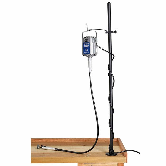 Rio Grandes exklusiva kraftiga Swing-Away™ motorställning låter dig dra motorn mot dig medan du arbetar. När du släpper armen svänger den automatiskt motorn och axeln ur vägen. Beställ extra swing-away-armar för att rymma så många motorer du behöver. Swing-away-armarna är konstruerade för att centrera sig själva. Orientera armarna på ställningen för att uppnå önskad förskjuten höjd och radiejustering för dina motorer. Den robusta aluminiumstången är 42" lång; basen på 3-1/4" x 3/16" är förborrad med två försänkta hål som gör att du säkert kan skruva fast ställningen på bänkskivan (fästdon ingår ej).