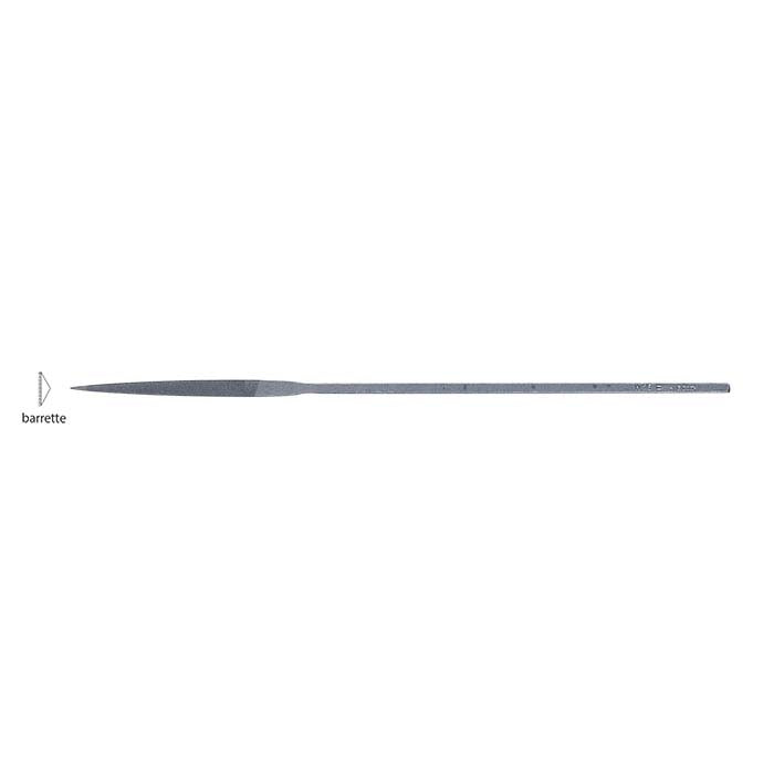 Denna Friedrich Dick barrette escapement-fil är idealisk för dina mest känsliga filnings- och formningsuppgifter, för att jämna ut små detaljer och för att skapa inskärningar. Använd denna dubbelklippta fil för att förfina plana ytor samt smala områden, raka kanter och strukturer, och yttre kurvor. Den har en bredbaserad triangelform som avsmalnar i bredd och tjocklek, och har tänder endast på undersidan; filen är dubbelklippt. Den säkra baksidan förhindrar borttagning av metall från intilliggande ytor. Denna fil har ett tyskt skär #8; tyska skärfiler graderas efter antalet tänder, räknat parallellt med filens långaxel. Tyska skär börjar grövre än schweiziska och går finare, vilket ger fler steg för mer precis skärning. I alla skärstilar gäller att ju högre nummer, desto finare skärning. En dubbelklippt fil har två uppsättningar jämnt fördelade tänder i två riktningar, där den ena är i en något annan vinkel än den andra. Dubbelklippta filer är utformade för att skära mer aggressivt, vilket maximerar varje drag för att ta bort mer metall med färre drag. I slutet av draget bör filen lyftas från arbetsstycket och placeras om för nästa drag; att dra filen bakåt mot metallen kan skada metallen och tänderna. Escapement-filer är smalare och tunnare än standard nål-filer med kortare skärytor och längre, fyrkantiga handtag. Effektiva på guld, silver, platina, titan, stål och andra metaller, är escapement-filer bäst lämpade för arbete som kräver liten metallborttagning. Bland världens finaste guldsmedsfiler är Friedrich Dick-filer tillverkade av tålig krom/verktygsstålslegering och precisionsbearbetade för att ge skarpa hörn och fina spetsar. Dessa filer har djupskurna tänder som ger effektiv och jämn materialborttagning och har en hårdhet på 66–67 HRC för exceptionell hållbarhet med minimal skötsel.