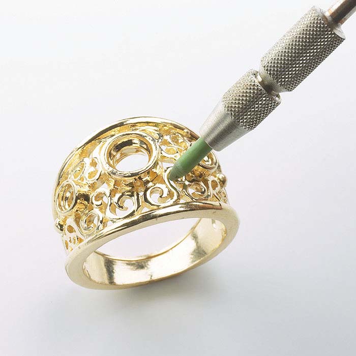 Denna gröna silikonpoleringsstift ger en superglans på ädla metaller. Poleringsstift, designade för efterbehandling och polering, är ett utmärkt val för att nå svåråtkomliga områden och fina detaljer. Stiftet passar i en 3 mm 3/32" skaftmandrel. Använd poleringsstiftet vid lägre hastigheter för större flexibilitet med en mjukare beröring, vilket ger subtila resultat; använd vid högre hastigheter för mer aggressiva resultat.