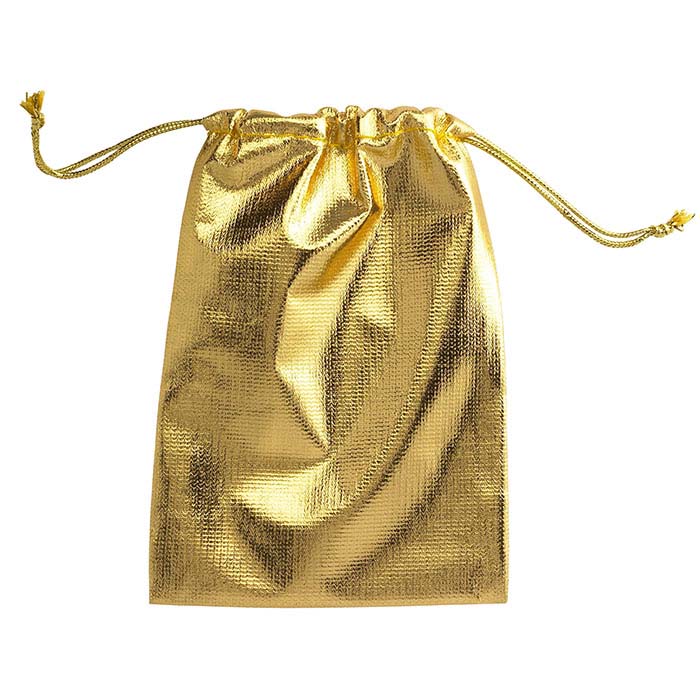 This lamé pouch offers an eye-catching bright metallic texture that draws attention to your packaging and provides a non-snag interior ideal for a wide variety of jewelry designs. Pouches hold most jewelry types, accommodate jewelry on appropriately sized jewelry cards, and are especially ideal for unusually shaped pieces. If desired, a pouch fits beautifully into a cotton-filled gift box for easy gift-wrapping. Pouches are a gift-within-a-gift packaging choice; after your customer presents the gift to its recipient, the pouch is ideal for holding keepsakes and tiny treasures—a second 'gift' that customers appreciate. Made with shiny silver lamé fabric, this pouch is unlined and has matching-color braided metallic cord drawstrings.