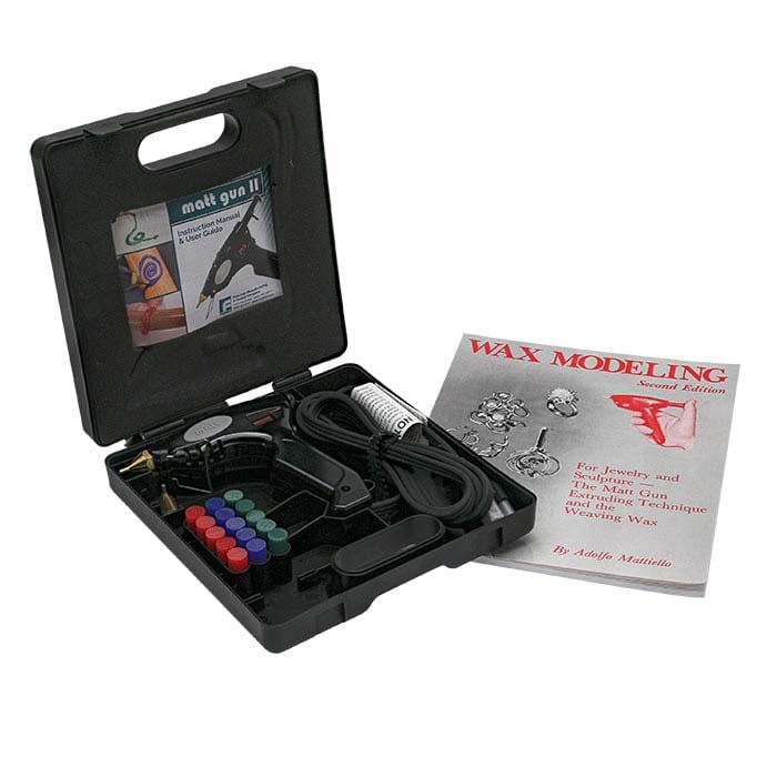 Detta unika verktyg producerar en ström av smält vax som är perfekt för designarbete. Den lätta vaxpistolen har en termostatisk kontroll som låter dig ställa in vaxtemperaturer från 120°F till 300°F. Kontrollera vaxflödet med en enkel tumtryckskontroll. Två munstycken (ett stort, ett litet) hjälper dig att uppnå olika vaxeffekter. Ett urval av vaxpatroner inkluderar tre formuleringar: blå för skulptering, röd för flätning och grön att använda i vatten för att skapa abstrakta former.