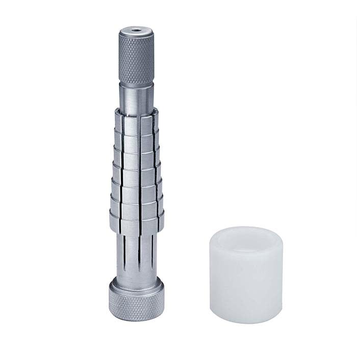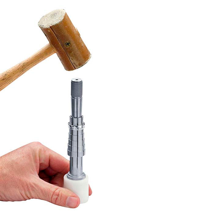 Denna Rathburn ringstretchare är ett ekonomiskt verktyg för att töja ringar som inte är infattade med ädelstenar. Sätt ringen på den trappstegsformade mandrelen, knacka sedan på den koniska insatsen för att sprida de stålbladiga delarna på multibladsmandrelen och töj försiktigt och jämnt ut ringen. Passar ringstorlekar 7-1/2 (US) eller större.