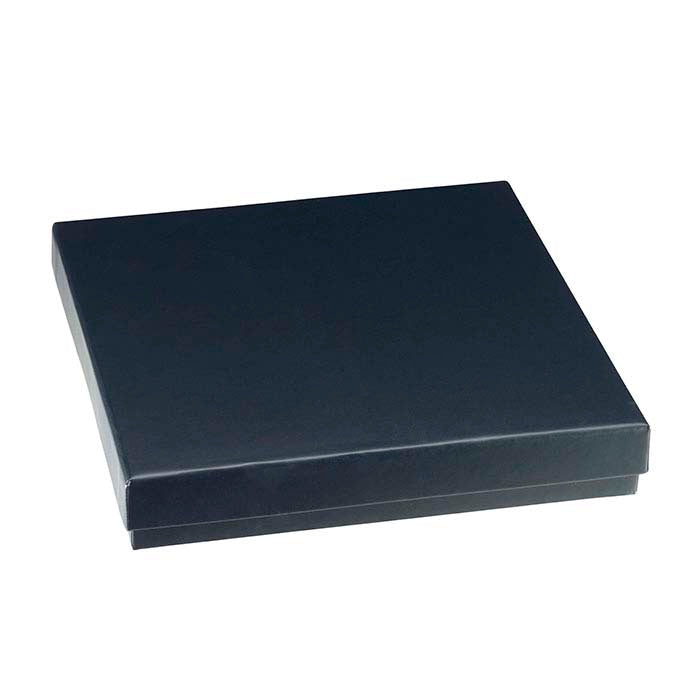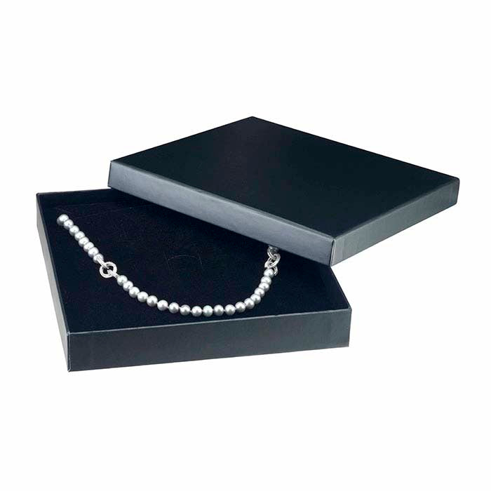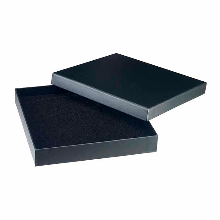 Denna tvådelade Soft Touch™-kombinationsbox täckt med papper rymmer ett halsband, ett par örhängen, ett hänge och/eller en ring, vilket gör den idealisk för koordinerade set. Lägg till ett dekorativt band, presentinslagning eller rosett (säljs separat) för att anpassa boxen. Mjuk, silkeslen matt svart Soft Touch™-papper som inbjuder till beröring täcker den robusta kartongboxen; en svart, stansad flockad skuminläggning ingår. Prägla din presentbox med ditt företagsnamn eller logotyp för att hålla dig i minnet långt efter smyckesförsäljningen.