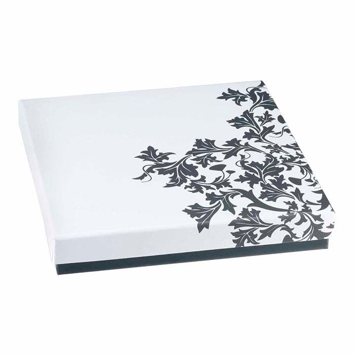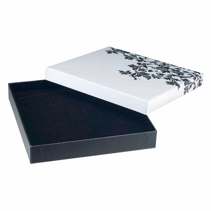 Denna tvådelade Soft Touch™-kombinationsbox täckt med papper rymmer ett halsband, ett par örhängen, ett hänge och/eller en ring, vilket gör den idealisk för koordinerade set. Lägg till ett dekorativt band, presentinslagning eller rosett (säljs separat) för att anpassa boxen. Mjuk, silkeslen matt svart Soft Touch™-papper som inbjuder till beröring täcker basen på den robusta kartongboxen; vitt papper med ett kontrasterande gotiskt blommönster täcker boxlocket. En svart, stansad flockad skuminläggning ingår. Prägla din presentbox med ditt företagsnamn eller logotyp för att hålla dig i minnet långt efter smyckesförsäljningen.