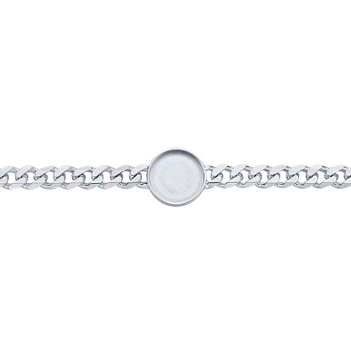 This sterling silver bracelet is made from two lengths of 4.4mm diamond-cut curb chain separated by a round 10mm bezel mounting; finish the bracelet with your cabochon or flat-back stone. This bracelet is ideal for customizing with birthstones or for creating collections offering a variety of stone types for customers to pick & choose, mix & match, creating their own changeable, updatable look. Use jeweler's epoxy to secure the stone in place. Precision, diamond-cut facets on the chain links reflect light with the slightest movement, giving the bracelet a bright, eye-catching finish. This bracelet is plated with fine silver to ensure a bright white color and to help protect against tarnish.
