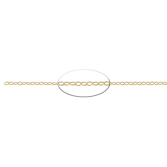 This lightweight 14/20 yellow gold-filled oval cable chain is the perfect backdrop for subtle, delicate designs. Offer it as-is, or add small charms, drops or dangles for a custom look. The most common chain style, cable chains are formed by simply connecting single links perpendicularly end to end. Links may be round, oval or other shapes.