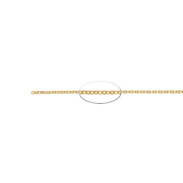 Denna lilla 14-karats guldfärgade flat-wire kabelkedja är en idealisk bas för hängen och mindre pendanger. Denna kedja är förgylld med 14-karats gult guld för att säkerställa en enhetlig färg. Länkarna som utgör rolo-kedjan är skapade av flat eller halv-rund tråd så att varje länk är bredare än trådens tjocklek. Formen på länkarna kan vara rund eller oval – länkarna på denna kedja är ovala. Denna kedja säljs per tum så att du kan köpa exakt den längd du behöver för dina design.