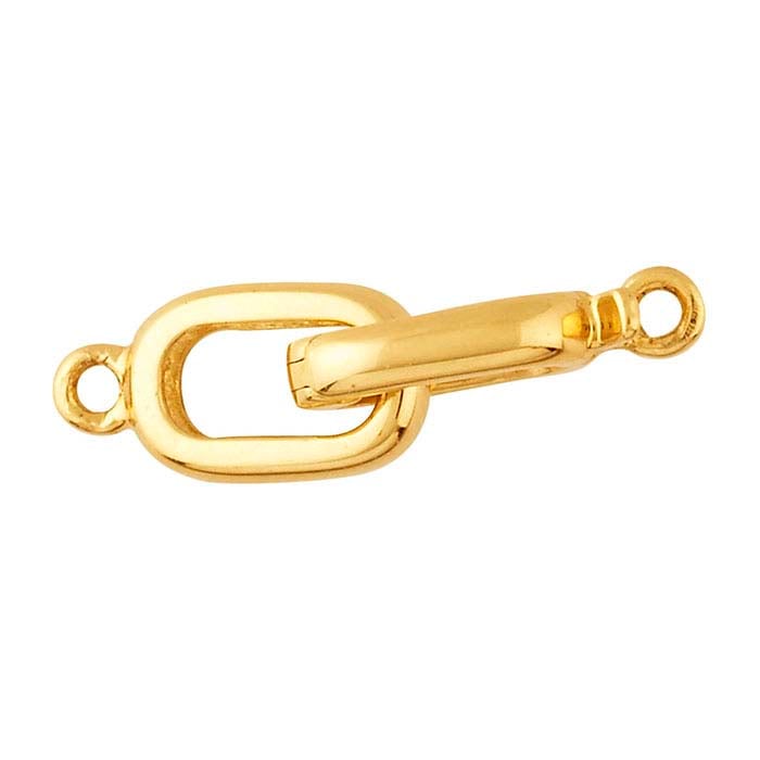Denna 14-karats guldfärgade gångjärnsfäste med krok och ögla har en oval form och är ett säkert val för lätta till medeltunga pärl- eller tillverkade halsbands- och armbandsdesigner. För att använda, fäst låset på kedjan eller tråden och öglan på motsatt ände. Häng låset på den öppna änden av öglan och tryck låset stängt för att säkra det. Krok- och ögellås är tvådelade lås som stängs genom att haka ena sidan (kroken) på en stor sluten ring (öglan). De tenderar att vara större än andra låstyper och är idealiska för större designer, pärlsträngar eller bib-stil halsband.