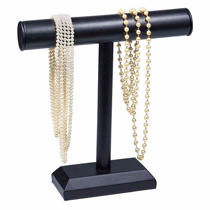 Detta halsbandsställ är idealiskt för att hålla ett urval av kedjor, halsband och armband i olika längder. Den breda diametern på den runda tvärstången (1-5/8") visar effektivt mer av designen på ett kedjemönster, och det svarta konstlädret ger ett sofistikerat utseende som framhäver dina smyckesdesigner. Konstlädret täcker vadderat trä och kartong.