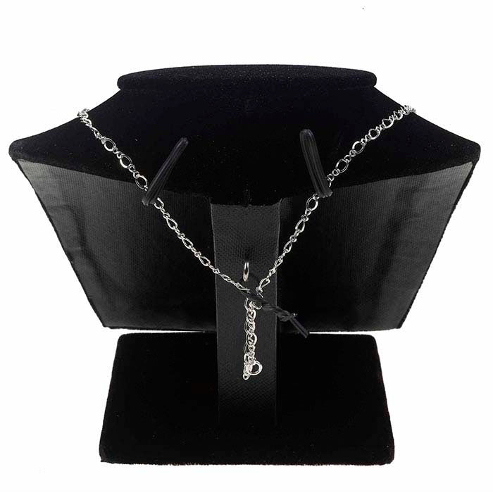 Denna halsbandsbyst håller ett halsband; den eleganta svarta sammetsoverflaten är ett idealiskt komplement till en mängd olika smyckesdesigner, inklusive både klassiska och moderna, färgstarka modeller. Den böjda konturen på bysten visar halsband och hängen med ett naturligt fall, vilket gör att kunderna kan se smycket som det kommer att se ut när det bärs. Två flikar och en ögla på baksidan av formen säkrar halsbandet i perfekt längd och håller överskott av kedjan. Mjuk svart sammet täcker vadat trä och kartong.