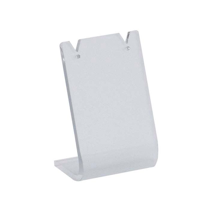 Denna frostad akrylskylt är idealisk för att visa ett enda par örhängen; skylten har både hål och skåror längs överkanten för att passa både stift- och trådstil på örhängen. Den frostade akrylen fungerar bra med praktiskt taget alla belysningsuppsättningar och ger örhängena illusionen av att sväva över ytan. Ställningar är perfekta för att skapa upprätta visningar för ett eller flera par örhängen; den extra höjden drar uppmärksamhet till utvalda smycken och ger djup åt mer komplexa displayarrangemang. Den lilla ytan på denna skylt gör att du kan placera den var som helst i en större display, snabbt flytta den till en ny position eller enkelt ta bort den från montern för kundens inspektion. Tillverkad av 1/8" tjock akryl med rundade kanter.