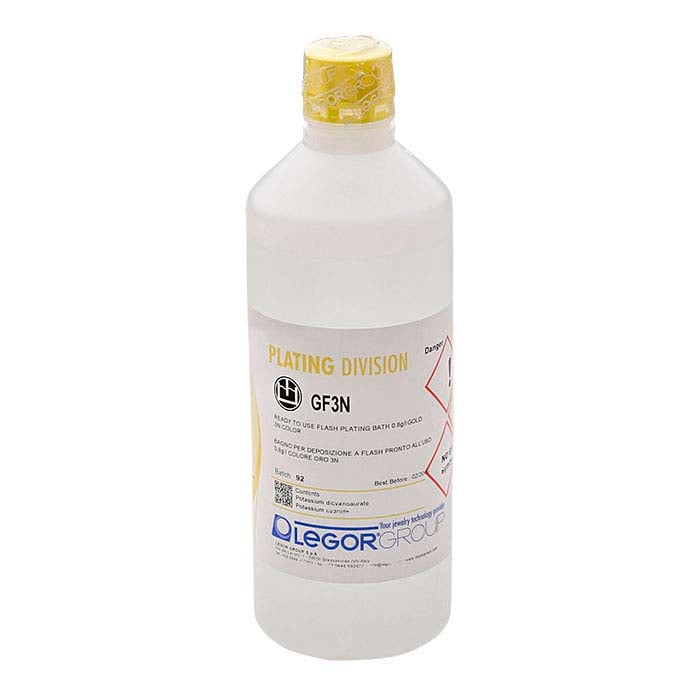 Idealisk för applikationer som kräver en flashplätering (upp till 0,2 mikron tjocklek) av gult guld, producerar denna Legor® GF3N pläteringslösning konsekvent en NIHS standard 3N guldton (en glänsande rik gul, liknande 18-karat). Den alkaliska lösningen är nickel-, bly- och kadmiumfri, och den toxiska nivån ligger under gränsen som fastställts av transportlagar. Använd denna lösning med en platiniserad titan-anod. Denna lösning är färdig att använda och ger god täckning och fördelning.