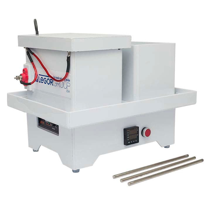 Öka din produktionskapacitet och plätera fler delar samtidigt eller plätera större föremål som ihåliga kärl eller små skulpturer med detta 5-literssystem från Legor® Group. Designat för att vara utbyggbart, har detta 5-liters pläteringssystem två stationer, vardera med en tank på 5 liter (6"B x 10"D x 7"H ID) och en påfyllningslinje som hjälper till att förhindra överfyllning. Det nedsänkta kvartsuppvärmningssystemet med återkopplande termoelement säkerställer effektiv uppvärmning och jämn temperatur i hela tanken. Tanken är tillverkad av polypropen, vilket gör den lätt samt korrosions- och fläckbeständig. Detta tvåstationssystem låter dig ställa in vilken processsteg som helst och ha en sköljstation precis bakom, redo att användas. Lägg till så många stationer du behöver för processen du använder i din verkstad. För steg som endast kräver doppning och sköljning finns en dubbelstation utan värme eller omrörning tillgänglig för integration i processen (ingår ej). Arbetstanken fram har individuella kontroller och kräver en likriktare för att reglera strömmen (måste vara 20 amp; ingår ej). Varje komponent är åtkomlig för enkel rengöring, reparation eller utbyte.