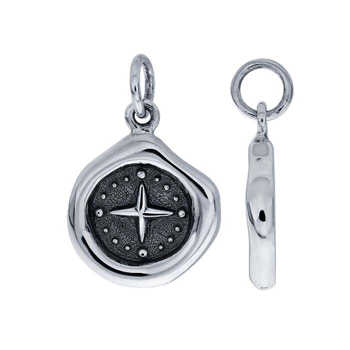 This sterling silver charm features a raised compass against a flat, oxidized background, giving a wax seal look. Create an earring drop or delicate pendant, or add it to more complex necklace and bracelet designs made with chain and cord. A jump ring is included.