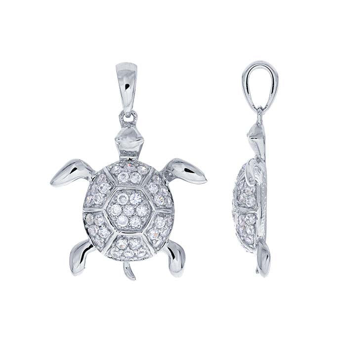 This sterling silver pendant features a 3D turtle and is set with several round white CZs on the shell. It looks great on its own or in combination with other charms and components. A rhodium plating ensures a durable, tarnish-resistant finish. This pendant includes a tapered bail.