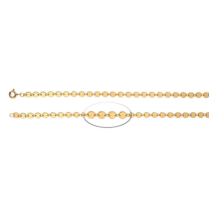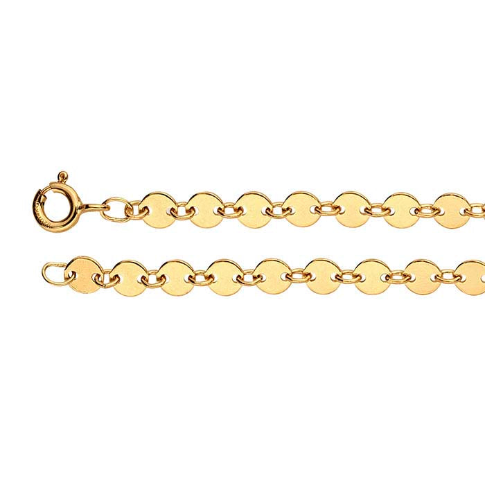 Featuring 4.1mm flat circles linked together with small rings, this 14/20 yellow gold-filled link chain offers an eye-catching look for custom necklaces and bracelets. Offer it as-is, or attach charms, drops or small pendants for a customized look. This gold-filled chain is plated with 14-karat yellow gold to ensure a uniform color.