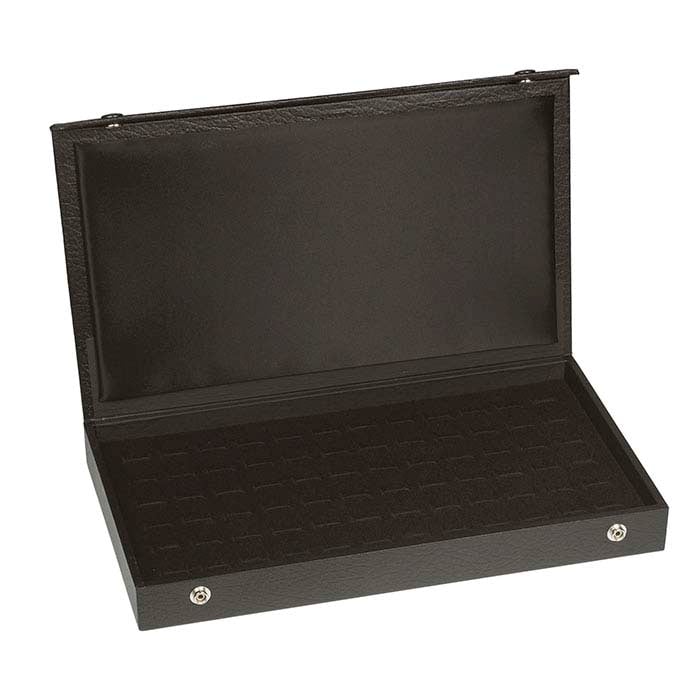 这个72槽戒指盒是存放、运输和展示各种戒指的理想选择;当托盘关闭时,戒指插槽和盖子之间有1/2英寸的间隙,以保护高凸戒指。木质和纸板盒外覆有纹理黑色纸张。黑色天鹅绒绒毛覆盖模切泡沫托盘插槽(1-1/4英寸深的戒指槽);黑色缎面覆盖铰链并衬里软垫盒盖。两个按扣闭合确保盒内物品安全。