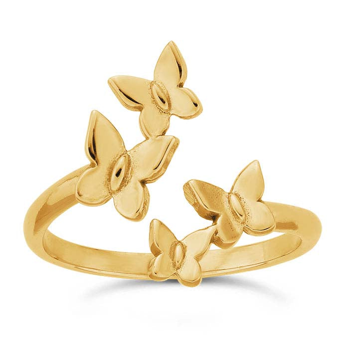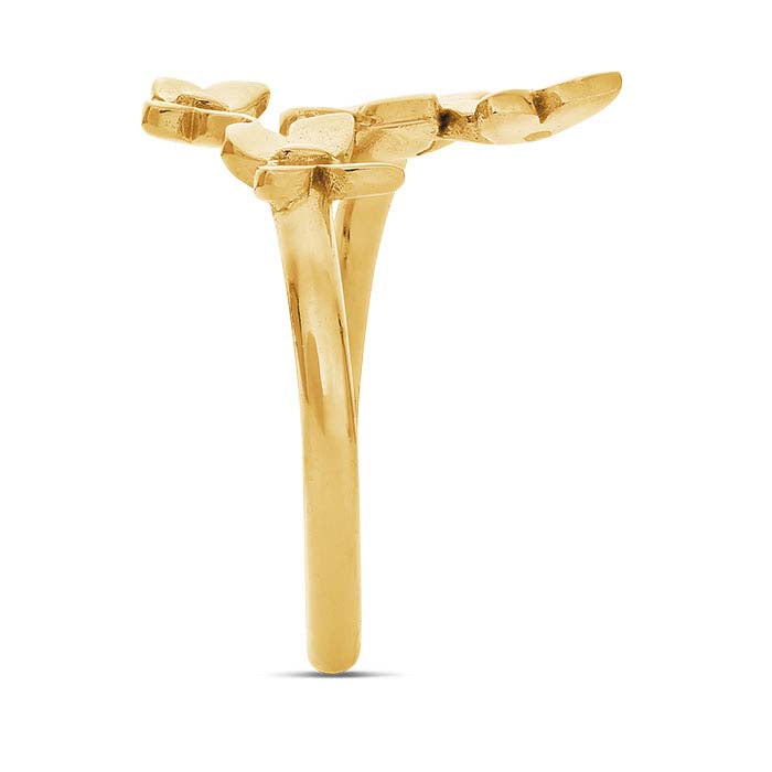 This bronze bypass ring features butterflies on both ends and has a bright finish. The bypass design creates a wrapped look and allows for small sizing adjustments.