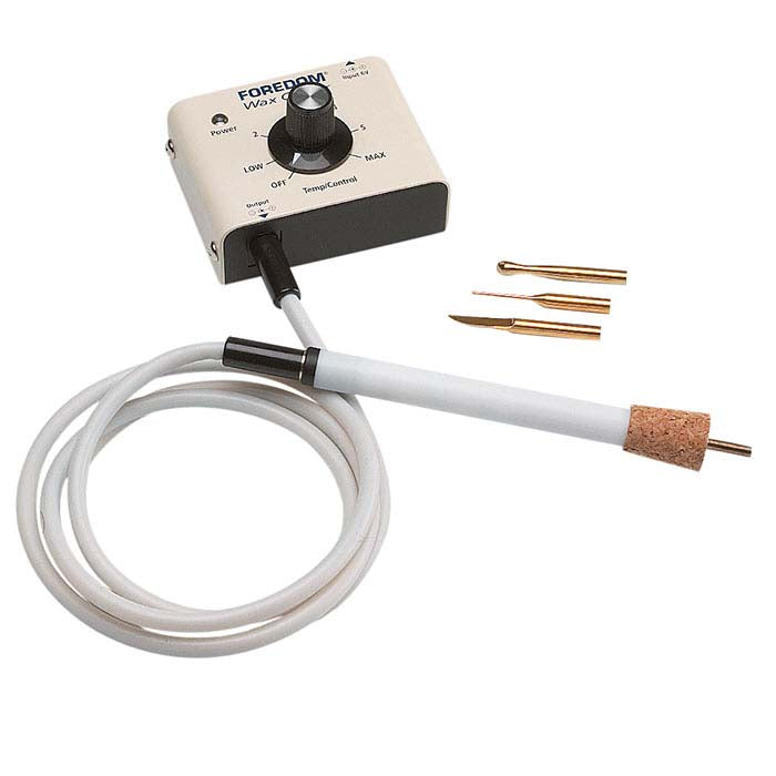This value-priced, dual-voltage Foredom® system provides everything you need to start making wax models and carving wax. It includes a benchtop temperature control box that adjusts the pen tip heat so you can work with a variety of wax grades. The 4-1/2"-long handpiece has a lightweight, comfortable feel, a protective cork heat guard and includes three different carving tips: