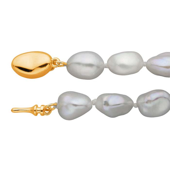 这款成品珍珠手链采用天然8–9毫米白色keshi珍珠制成。它配有一个镀14K黄金的纯银按压释放扣。