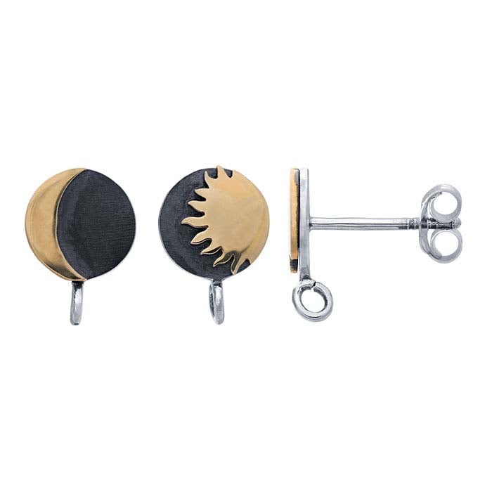 These finished earrings feature a brightly-finished bronze sun and moon—one post holds a crescent moon, the other holds a sun on a dark, oxidized background. Each has a ring for attaching a drop or dangle. The friction post features a groove that helps provide the most secure and comfortable fit; ear nuts are included.