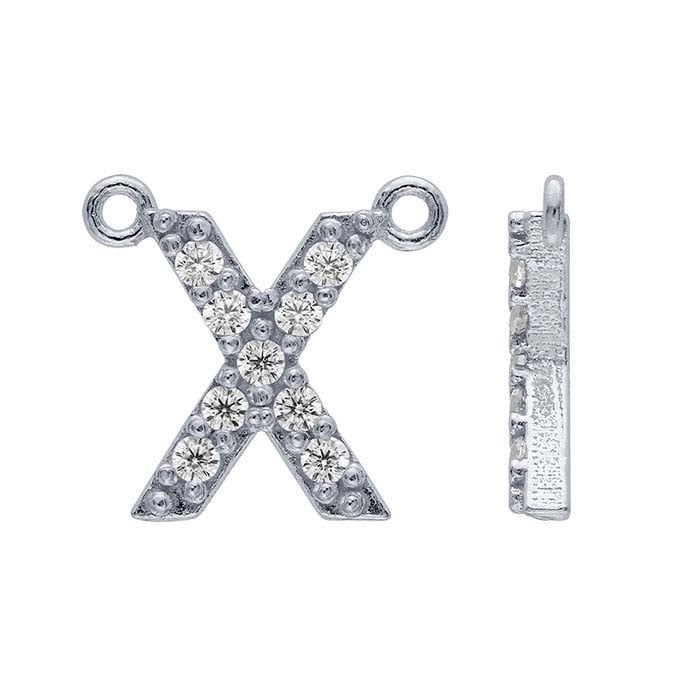This sterling silver alphabet festoon pendant features an uppercase block letter "X," perfect for adding a personalized touch to custom jewelry designs. The entire front face of the letter is set with CZ's for an eye-catching finish. Suspend the pendant between two lengths of chain or connect it to other design elements. Two fixed attach rings ensure the pendant remains centered in your finished piece.