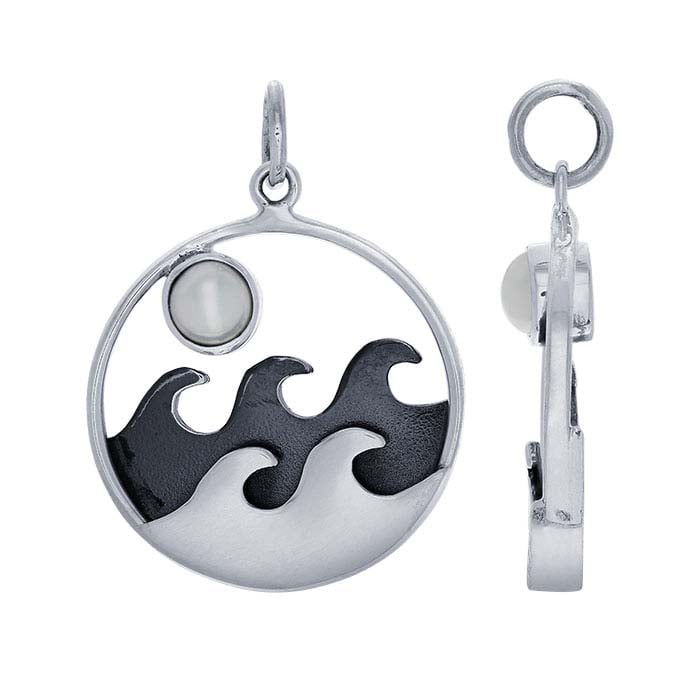 This handcrafted sterling silver pendant features an open circle frame with two rows of cresting waves under a freshwater cultured button pearl; the back row of wavs is oxidized while the front is brightly-finished, creating a layered design that provides visual interest and depth. Use it as the centerpiece of a cord or chain necklace or combine it with a variety of charms, components or beads in more complex designs. The pendant includes a closed ring.