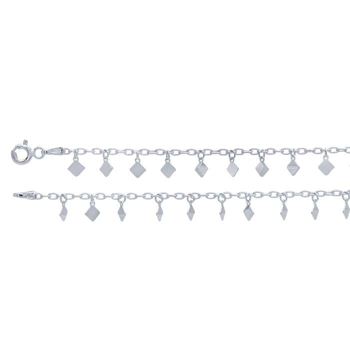 This sterling silver cable chain necklace features diamond-shaped drops spaced evenly along its length. The drops have a bright-finish, ideal for customizing with stamped designs. This necklace is plated with fine silver to ensure a bright white color and to help protect against tarnish.The most common chain style, cable chains are formed by simply connecting single links perpendicularly end to end. Links may be round, oval or other shapes.