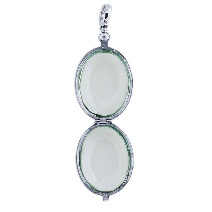 This oval double-sided glass locket features a scalloped-edge sterling silver frame and has a swiveling bail that makes it fully and instantly reversible. Insert two photos back-to-back, or display tiny mementos such as a lock of hair or small flower; the antique glass gives the contents a vintage look. Because this locket is handcrafted, no two are exactly alike. The locket is easy to open to change the contents—unscrew the small nut at the top until the front is released (3-4 turns).