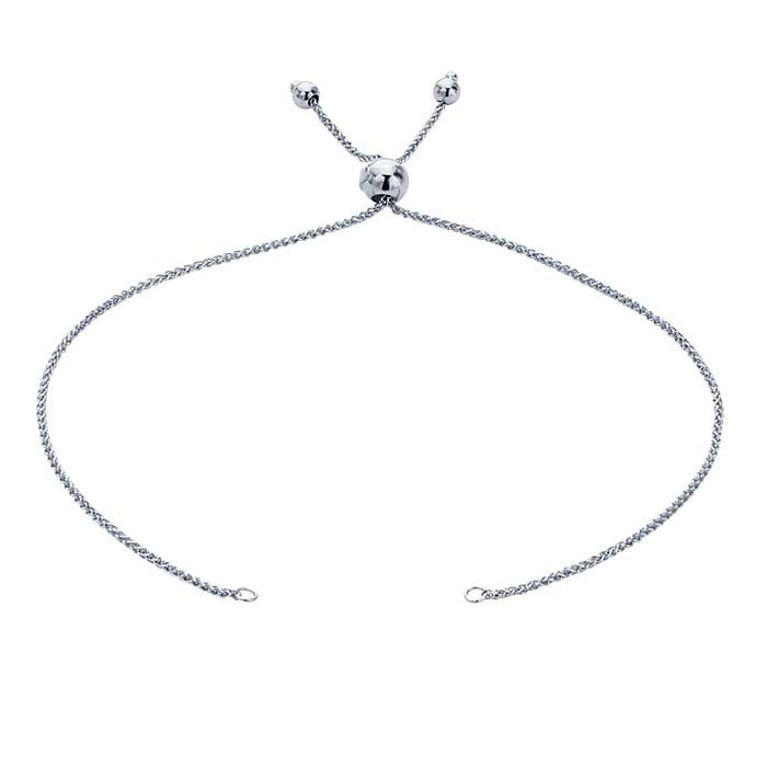 This 14-karat white gold diamond-cut wheat chain bracelet component is open at the center with a 0.058" ID closed ring at each open end; complete the bracelet with a link component, an engravable plaque, or a short length of strung or wire-wrapped beads. The bracelet is fully adjustable using a movable round silicone-lined bead (5mm) that slides along the chain. Two round drops (3mm) finish the chain and serve as a stop to keep the slider bead from slipping off the chain.A variation of the rope chain, wheat chain is made with alternating figure-eight links that are closely interconnected to present a braided look and an almost square profile. Diamond-cut versions have facets precision-cut into the links with diamond-tipped tools. The facets are then polished to enhance the light-reflecting properties of the link surfaces. This chain is plated with rhodium to ensure a durable, tarnish-resistant finish.