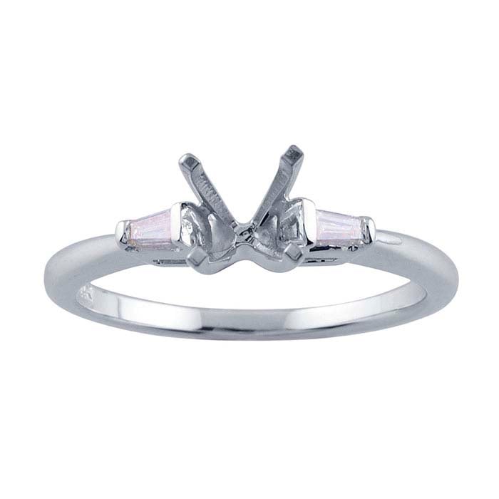 This 14-karat white gold ring mounting features a 4-prong center mounting that holds one 5.8mm (3/4-ct., approx.) round faceted gemstone. For a twist on a classic design, the shank is semi-mounted with two 3 x 2mm (approx. 0.07-ct.) tapered baguette accent diamonds (SI1 clarity/G, H color; 0.14CTTW) flanking the center mounting. Cut a seat in the prongs to accommodate your stone, then burnish the prongs over the stone to secure it in place.