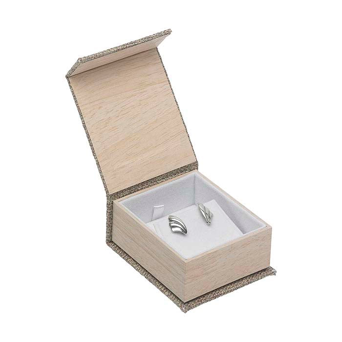 This burlap-covered "Cabana" gift box accommodates one pendant or a pair of earrings; the color and texture of the fabric complements all metal types and gemstones. The subtle, two-tone color scheme and magnetic flap closure give the box an eye-catching, high-end look. Add a decorative ribbon, gift wrapping or bow (available separately) to customize the box. Burlap covers the top and bottom of the plastic box; the sides and the inner surface of the lid are covered with woodgrain patterned paper. White velveteen covers the die-cut, tapered stand-up insert. The box is delivered in a cardboard sleeve.Hot stamp or custom print the box with your company name or logo, keeping you top-of-mind long after the jewelry sale.