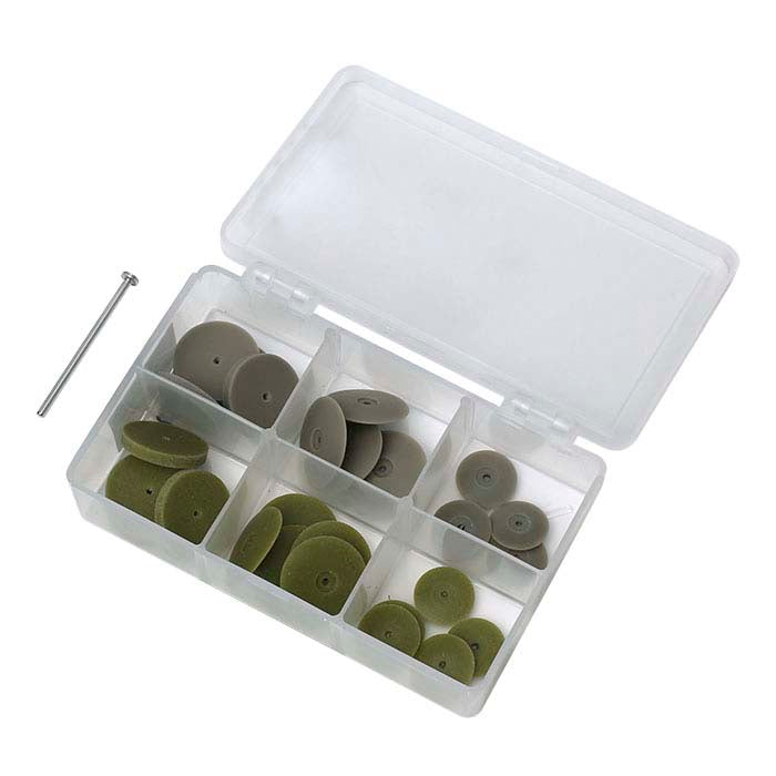 The pumice polishers in this kit are safe to use around most gemstones, making the polishers ideal for use on settings and other metal work already set with stones. The medium abrasive buffs out nicks and imperfections and the fine abrasive adds that final shine to metal surfaces. For best results, run the polishers at 7,000–10,000rpm with very light pressure. This kit includes 30 unmounted EVE pumice polishers and one screw mandrel in a durable plastic case.