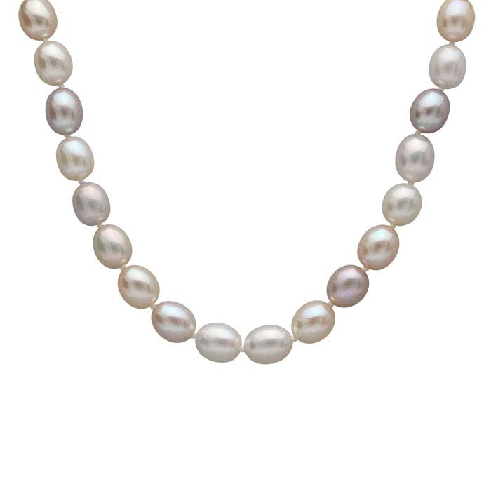 This finished pearl necklace features cultured 7.5–8mm white oval pearls. It is finished with a sterling silver push release clasp that is plated with rhodium.