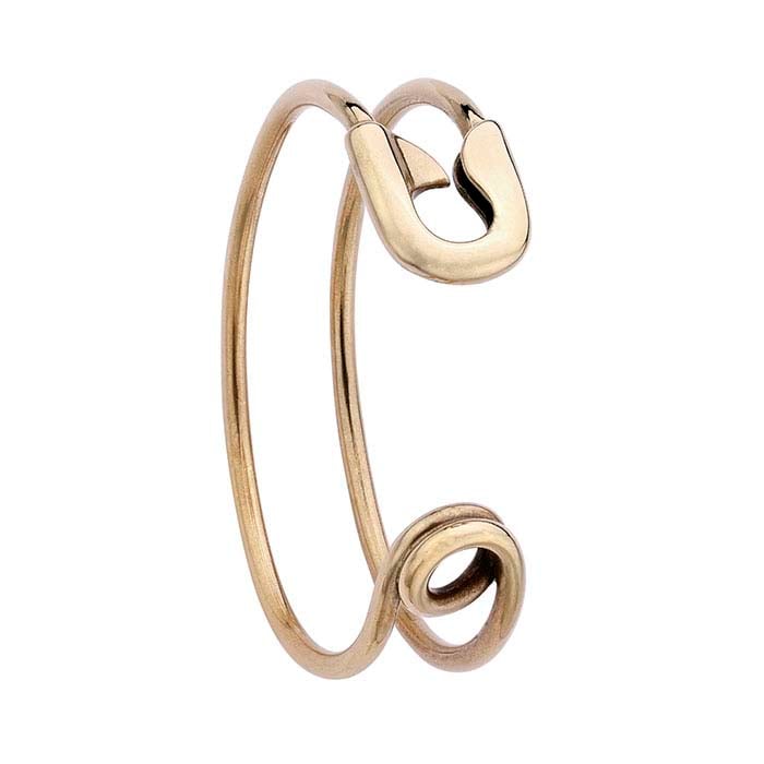 This bright-finished bronze cuff bracelet is designed to resemble an oversized safety pin formed into a cuff. The design has three-dimensional detailing and is bright finished. Offer it as-is, or use it as a base for attaching charms, beads or wire-wrapped designs.
