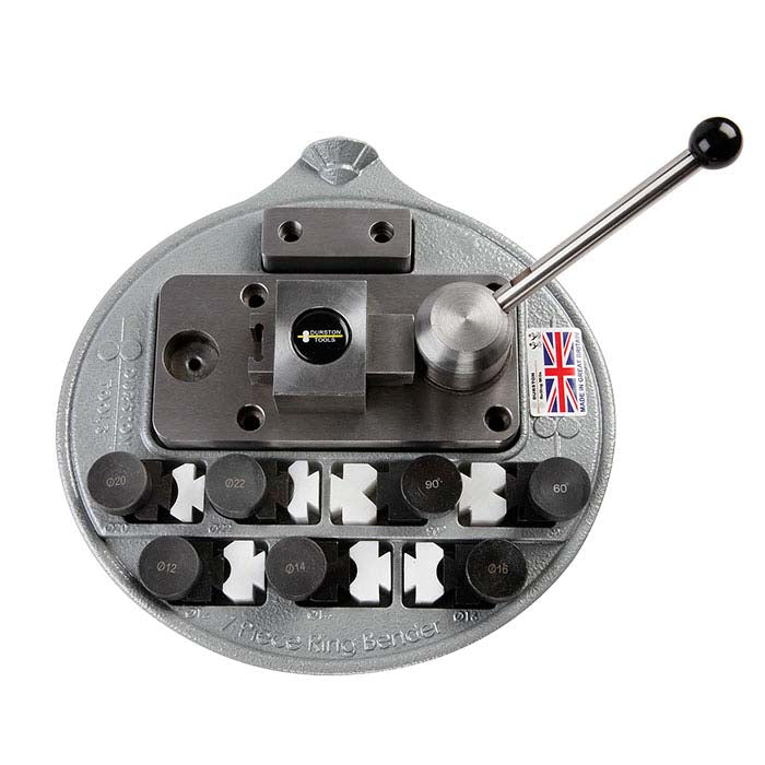 تم تصميم مجموعة ثني الخواتم هذه باستخدام خبرة Durston الحائزة على جوائز في التصميم والهندسة، مما يتيح لك إنشاء الانحناءات والزوايا بسهولة في مخزون قياس الخواتم أو شرائط المعدن. يوفر أداة الثني سبعة أزواج من القوالب المصنوعة من الفولاذ المشكّل وشفرات Delrin® غير المسببة للخدش. كل قالب فولاذي تم تصلبه إلى 64 HRC وتم تشطيبه بدقة لتقليل خدوش أسطح المعدن. إذا رغبت، يمكن تثبيت أداة الثني بشكل دائم على منضدتك باستخدام الفتحات المصبوبة بشكل مريح في القاعدة (الأجهزة غير مشمولة). تتضمن هذه المجموعة سبعة قوالب: