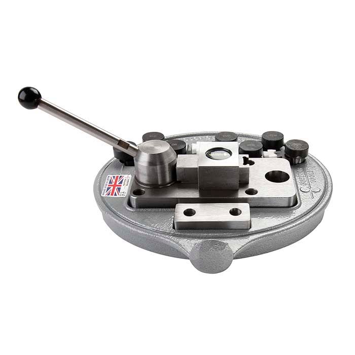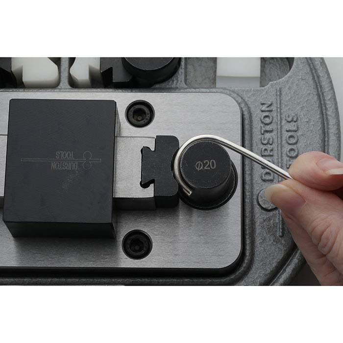 Built with Durston’s award-winning design and engineering expertise, this ring bender set allows you to easily create curves and angles in ring sizing stock or metal strips. The bending tool offers seven shaped forming steel and non-marring Delrin® die pairs. Each tool steel die is hardened to 64 HRC and is finely finished to reduce marring metal surfaces. If desired, the bender may be secured permanently to your bench using the holes conveniently cast into the base (hardware is not included). This set includes seven dies: • Two sets (one steel, one Delrin®) of five round dies: 12, 14, 16, 20, 22mm diameter • Two sets (one steel, one Delrin®) of two angled dies: 60° and 90°