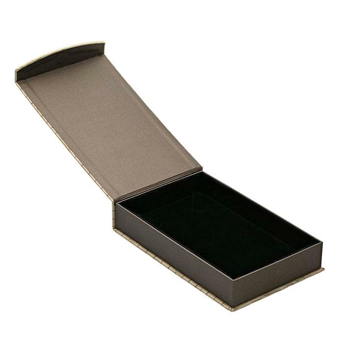 يتم تسليم هذا الصندوق في عبوة كرتونية من قطعتين. قم بطباعة اسم شركتك أو شعارها على العبوة الكرتونية باستخدام الطباعة الساخنة، مما يجعلك في ذهن العميل لفترة طويلة بعد بيع المجوهرات. أضف شريطًا زخرفيًا، تغليف هدايا أو فيونكة (متوفرة بشكل منفصل) لتخصيص الصندوق.