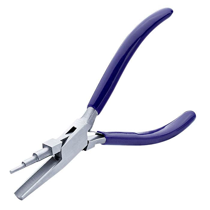 Specifically designed to meet the needs of wire-wrappers, the three-step jaw of these wire-wrapping pliers gives you the ability to create the widest variety of loop sizes without changing tools. The steps are approximately 2.6, 3.8 and 5.5mm in diameter. The facing jaw is concave to shape the wire easily around the curve of the stepped jaw.• These pliers have a box joint; one half of the joint surrounds the other and the pivot is contained within. This joint holds its alignment far longer than a lap joint but allows the tool to open only as far as the box size.• The double-leaf spring consists of flat, tempered metal tabs attached to the inside of each handle, positioned to meet and hold the handles apart (and the jaws open) until they are squeezed closed.•The plastic-dipped handles ensure a comfortable grip.